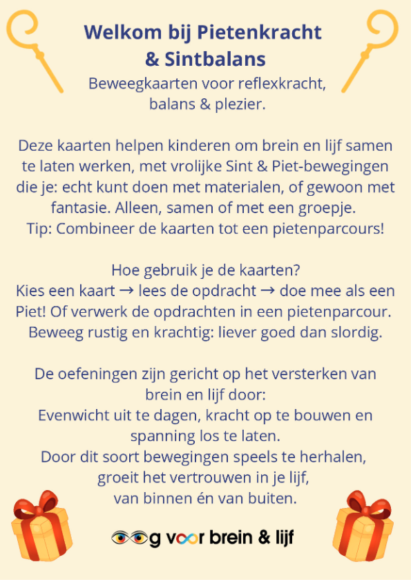 Elke kaart bevat een speelse Sint- of Pietopdracht die brein en lijf laat samenwerken. Perfect voor in de klas, tijdens een pietentraining of gewoon thuis.